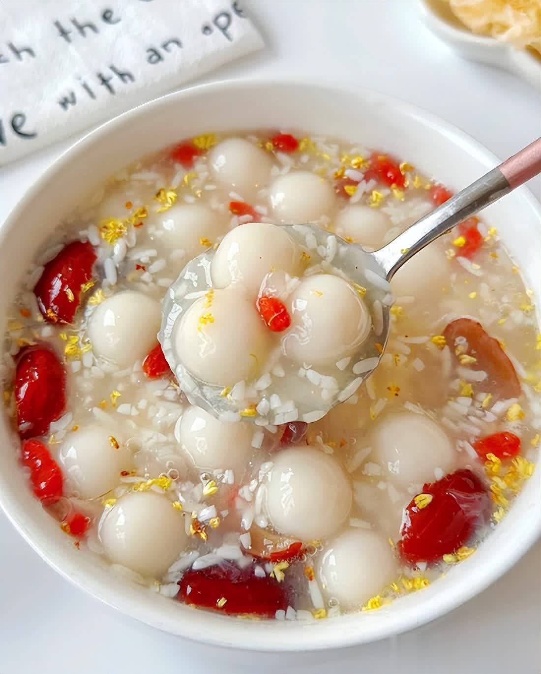 7. 加入红糖和枸杞,搅动均匀,煮至红糖实足溶解,然后倒入淀粉水勾芡,使汤汁变得浓稠,临了放入过凉后的小圆子,搅动均匀即可。